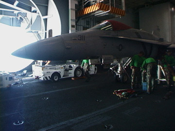 An F-18A Hornet receiving repairs in the hanger below the flight deck. |